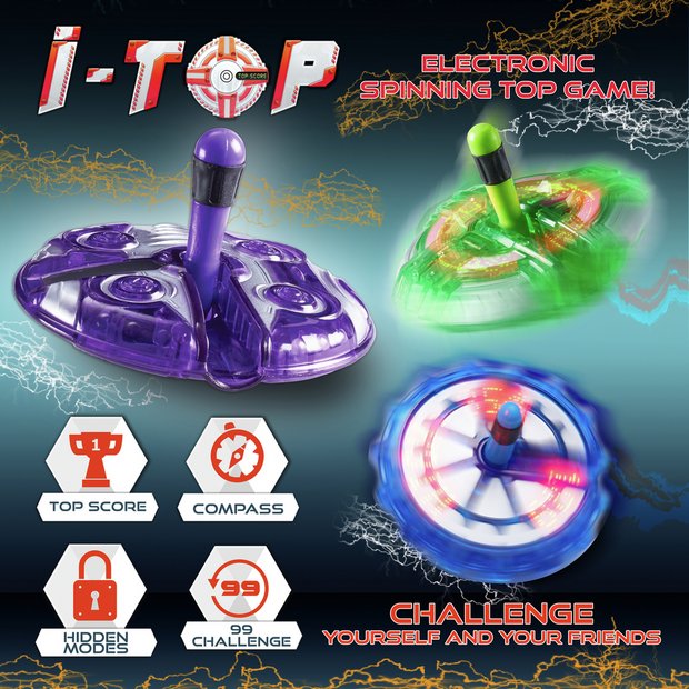 A fidget spin-to-win masterpiece game to challenge yourself or your friends! The pocket-sized electronic spinning top counts the number of revolutions and keeps track of scores - can you beat the highest score? With 3 main play modes including – Top Score, 99 Spin Challenge and a Compass mode. The clever i-Top also comes with unlockable play modes – spin the secret combinations to see special animations appear. It's simple to do but will take practice to master. Available in purple, green and blue colourways.